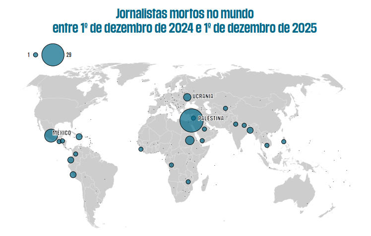 A Organização Não Governamental Repórteres Sem Fronteiras divulgou os resultados de 2025 de seu balanço anual de jornalistas mortos, presos, reféns e desaparecidos pelo mundo. O documento, que analisou dados divulgados entre 1º de dezembro de 2024 e 1º de dezembro de 2025 mostrou que o número de jornalistas assassinados voltou a aumentar neste ano, principalmente devido às práticas criminosas das forças armadas, regulares ou não, e do crime organizado.